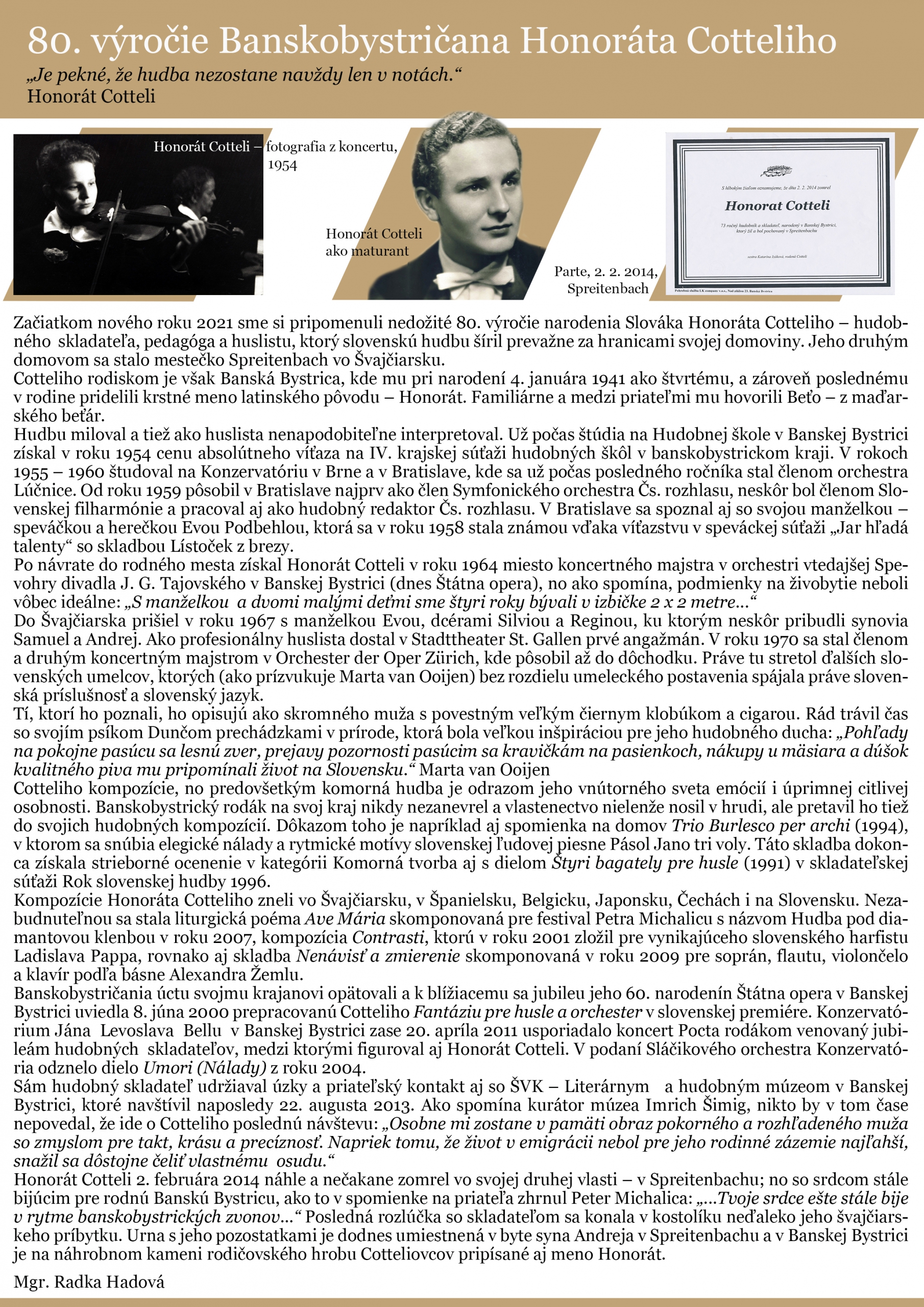 80. výročie Banskobystričana Honoráta Cotteliho Od Peter Sotik|2021-05-11T09:57:18+02:0026. januára 2021|Kategórie: LHM, SVKBB|Tags: hudba|Komentáre vypnuté na 80. výročie Banskobystričana Honoráta Cotteliho Zdieľajte tento príspevok, Vyberte si svoju platformu. FacebookXLinkedInTumblrPinterest Súvisiace príspevky Ľudové hudobné nástroje na Slovensku 11. augusta 2025 Bábkarský salón 29. júla 2025 OZNAM O OTVORENÍ 26. februára 2024 Za Ladislavom Burlasom … 14. februára 2024 23. januára 2024