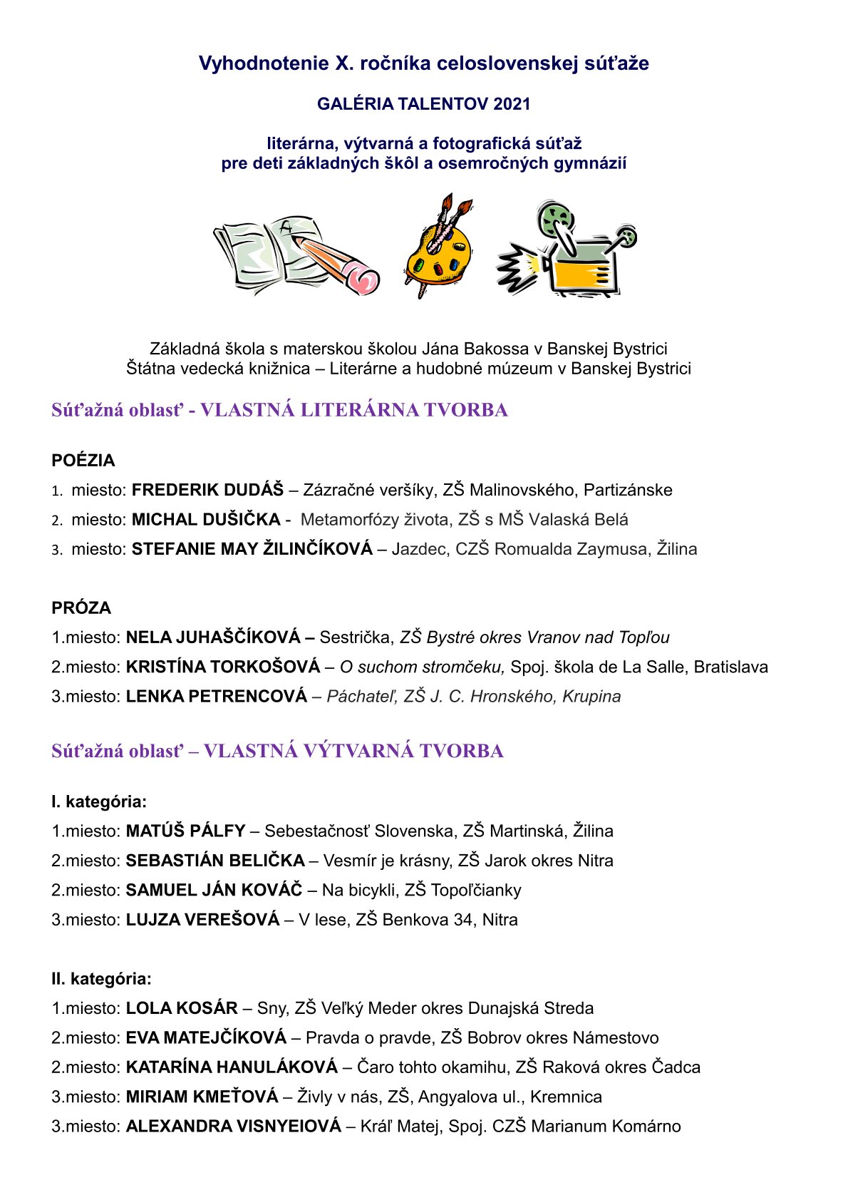 Literárne a hudobné múzeum pri ŠVK v Banskej Bystrici v spolupráci so ZŠ s MŠ Jána Bakossa v Banskej Bystrici zorganizovalo v apríli tohto roku už 10. ročník celoslovenskej súťaže Galéria talentov – literárnej, výtvarnej a fotografickej súťaže pre deti základných škôl a osemročných gymnázií.