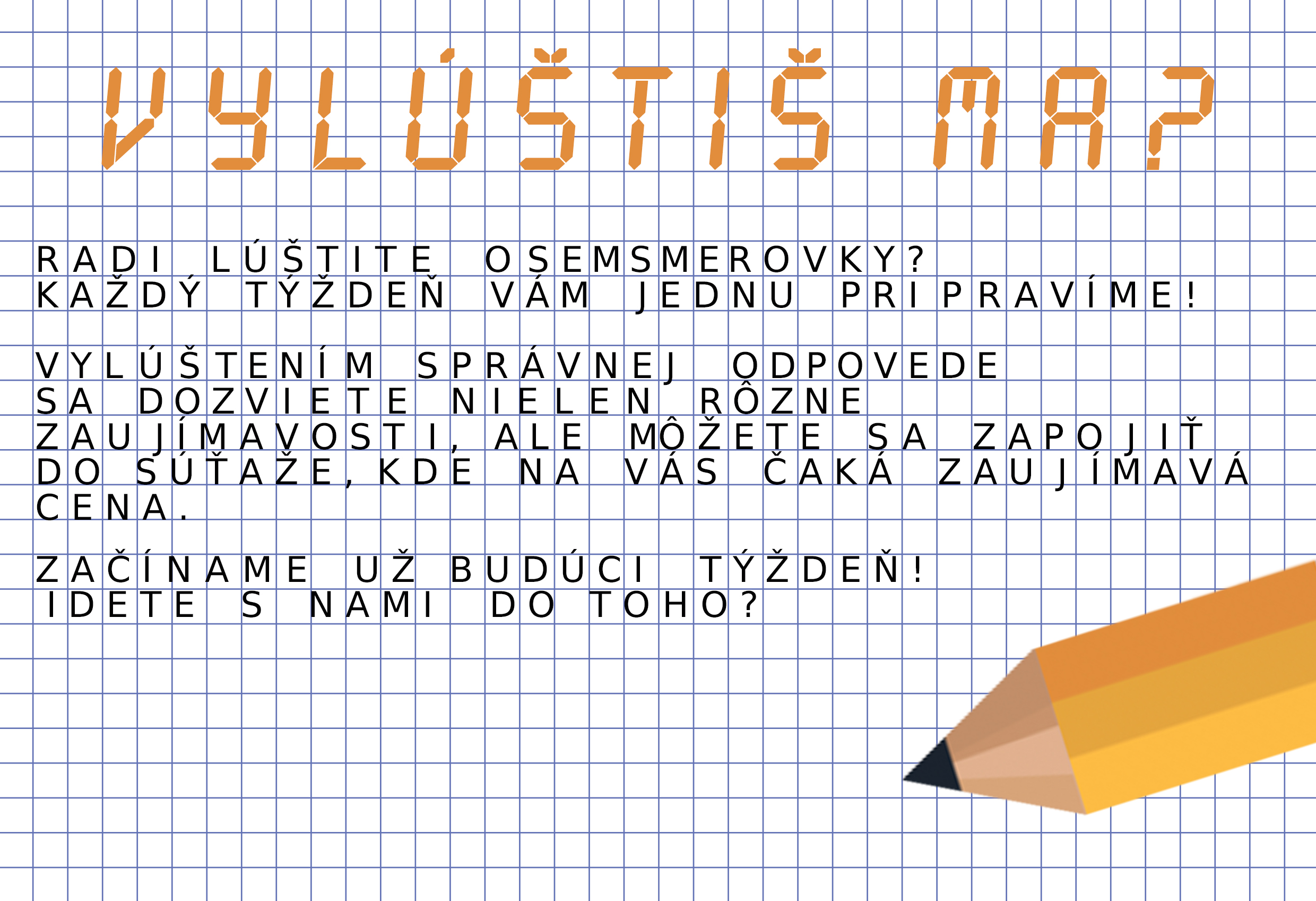 Každý týždeň v pondelok je pre súťažiacich pripravená osemsmerovka. Za svoju snahu a správne odpovede si súťaženia chtiví postupne na svoje konto pripisujú body. Víťazom sa stane ten, kto získa najväčší počet bodov. Súťaž bude ukončená posledným príspevkom 13. decembra a finálnym vyhodnotením v piatok 17. decembra. Neváhajte sa zapojiť, ešte stále stíhate! Sledujte stránku: www.facebook.com/LHMBB vylúštite osemsmerovku každý týždeň a správne odpovede zašlite do osobnej správy. Veľa šťastia!