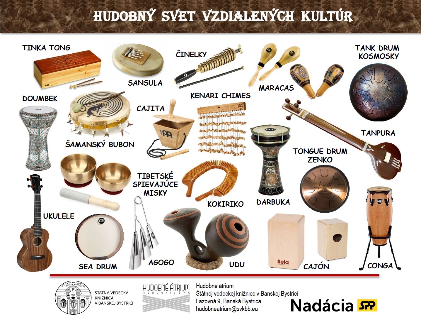 Návštevníci Hudobného átria sa môžu tešiť na tureckú darbuku, egyptský doumbek, indickú tanpuru, africkú sansulu, jazýčkový oceľový bubon tank drum, drevený štrbinový bubon Tinka Tong, cajon, šamanský bubon, congá, ako aj ukulele a ďalšie nástroje. Súčasťou prehliadky budú aj drobné perkusie, ako napríklad oceľové agogo, drevené kokiriko, maracas cabala, cajita, bronzové činelky, himalájske spievajúce misky a ďalšie. Nástroje zaujmú tvarom, zvukom, materiálom, špeciálnou hrou a sú aj pastvou pre oči.
