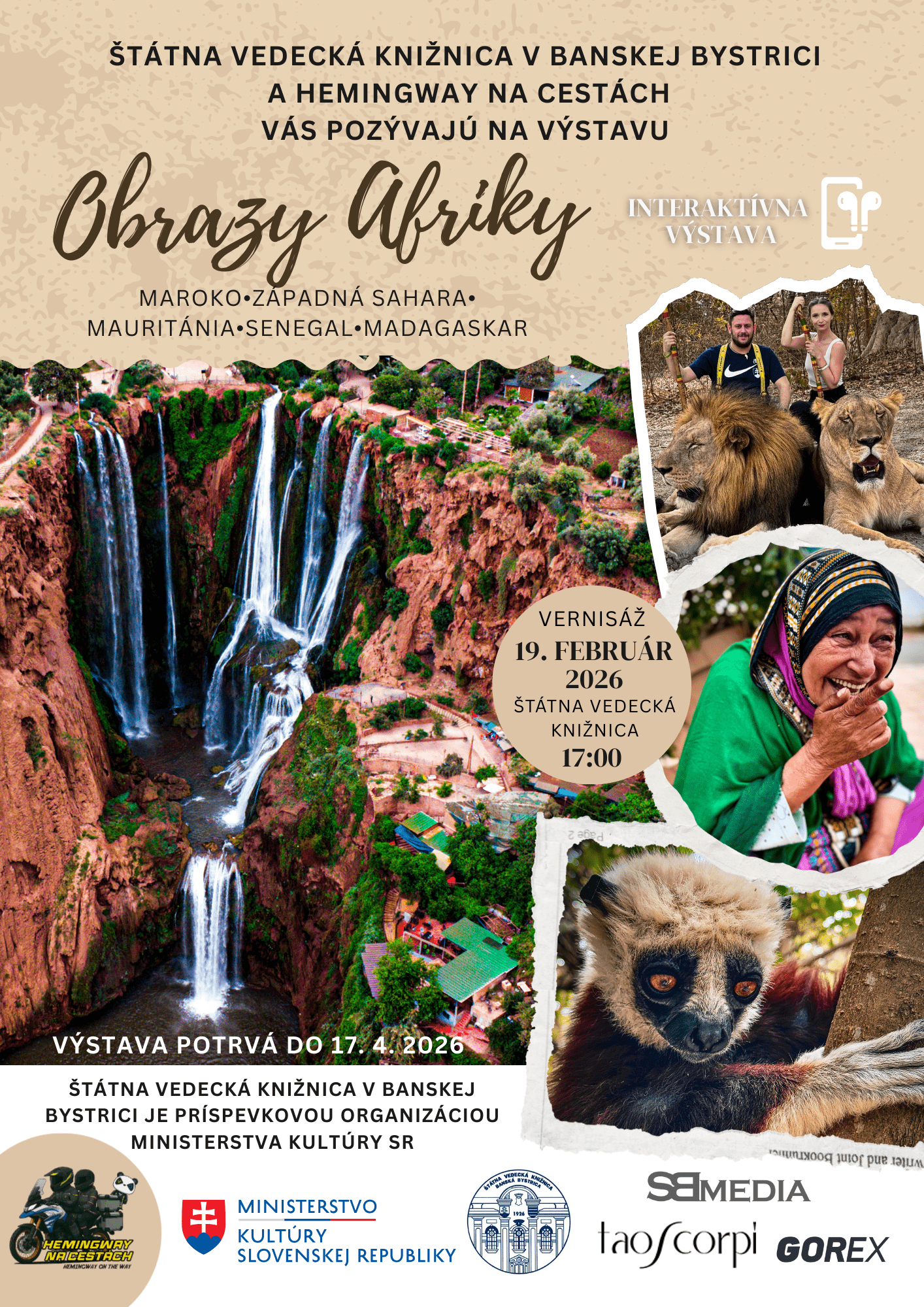 Táto výstava predstavuje fotografie z ciest západnou Afrikou – Marokom, územím Západnej Sahary, Mauritániou a Senegalom – doplnené o kontrastnú sériu z opačnej strany kontinentu, z Madagaskaru. Kolekcia zachytáva prostredia, prírodu, zvieratá, ľudí a každodenné situácie, ktoré odhaľujú rôzne podoby života na africkom kontinente. Fotografie vznikali počas cestovania Júlie Kmeťovej a Simona Bartha na ich vernom spoločníkovi HEMINGWAYOVI (motocykli Voge 525 DSX), ktorý im umožnil byť v priamom kontakte s miestnymi komunitami. Zábery sa sústreďujú na prirodzené momenty, tradičné remeslá, detstvo, prírodu, prácu a rytmus miest, v ktorých sa bežný deň stáva hlavným príbehom. Výstava ukazuje Afriku bez zjednodušených predstáv. Predstavuje rôznorodé prostredia – od saharských oblastí až po tropický Madagaskar – a zdôrazňuje ich odlišnosti aj spoločné znaky. Výstava je interaktívna, preto odporúčame návštevníkom zobrať si mobilný telefón – najlepšie aj so slúchadlami. Jednotlivé panely obsahujú QR kódy, ktoré po naskenovaní zobrazia video priamo z miesta vzniku fotografie a ponúknu ďalšie zaujímavosti.